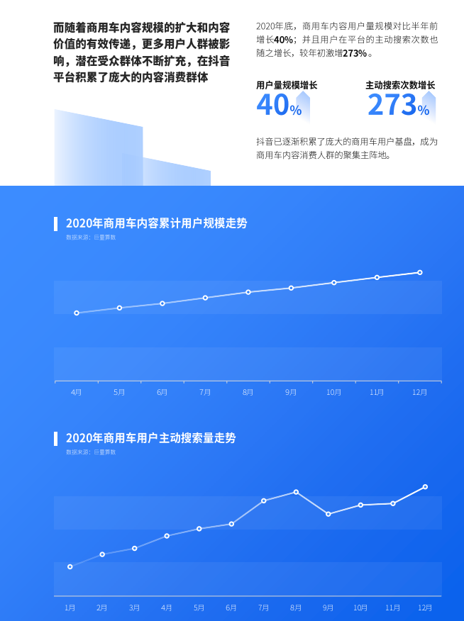 随着商用车内容规模的扩大和内容价值的有效传递,更多用户人群被影响,潜在受众群体不断扩充。2020年底,商用车内容用户量规模对比半年前增长40%,主动搜索次数增长273%。
