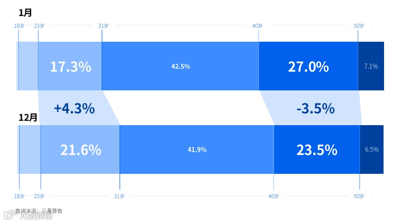 人群年轻化趋势明显。无论货车还是客车兴趣人群,年轻用户占比均呈扩大趋势。货车用户较年初相比,24到30岁占比增加4.3%,41-50岁占比降低3.5%。