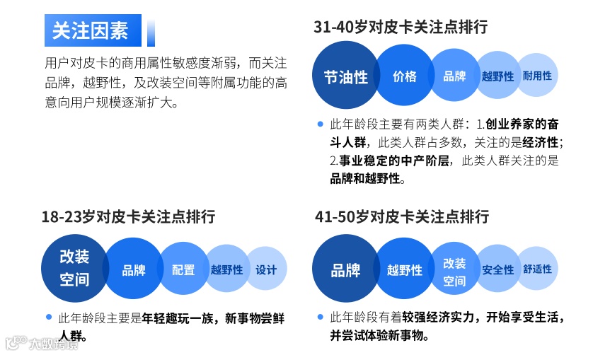 而不同年龄段的人群,购买关注因素也呈现多元化。以皮卡领域为例,三个重点年龄段的生活圈层及生活态度不同,购车关注点也呈现鲜明的差异化。