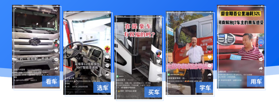 商用车内容包含售前和售后等场景,覆盖“看车-选车-买车-学车-用车”等全链路,“看/选车”内容数量占比最高,占整体场景的25%以上,线上看车/选车的线上化程度越来越高。