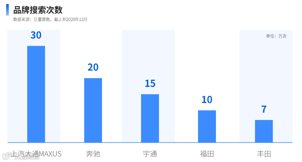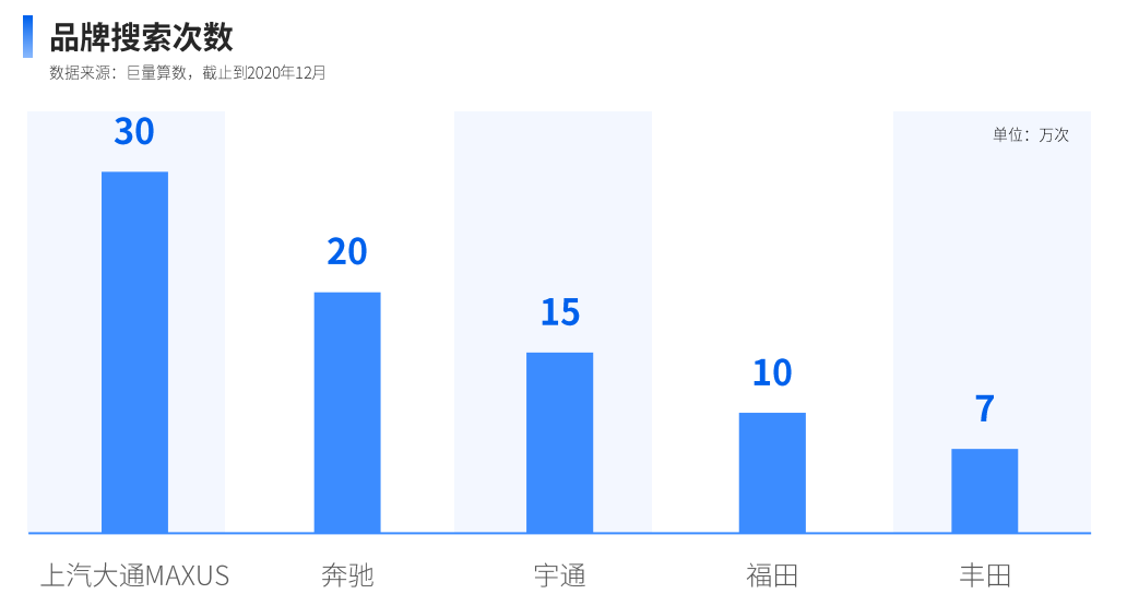 在对客车的关注因素中,用户对品牌更为重视,2020年对品牌的搜索次数超过100万次,品牌价值需进一步传递给用户。