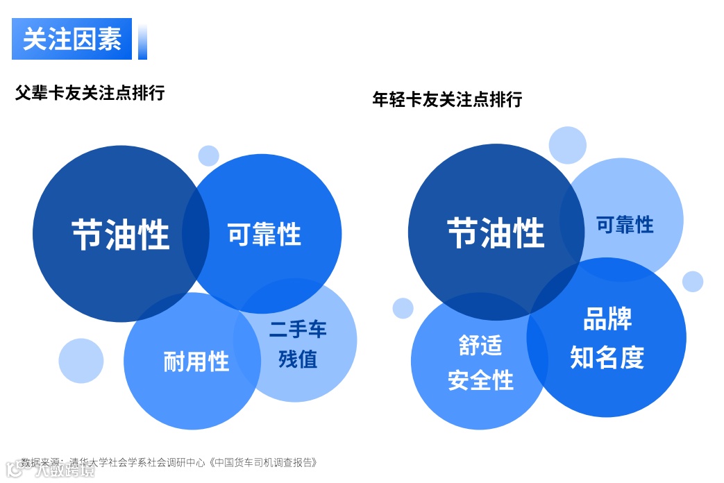用户关注点发生变化。尽管节油性依旧是年轻和父辈两代用户共同决策点,而年轻卡友对品牌及安全舒适性关注增强,对经济价值敏感度减弱;品牌知名度成年轻用户的新关注点,产品和车辆附属功能的关注占比也增加,货车从纯粹的“生产工具”转变为“生意伙伴”,用户购车决策更具个性化。