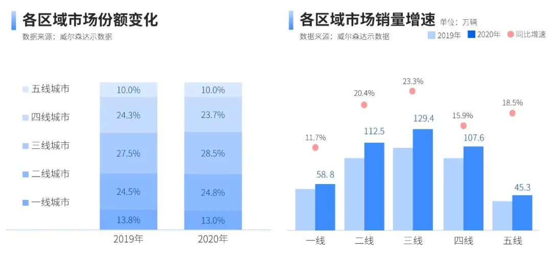 从全国各区域销售情况来看,商用车的销量集中在二三四线城市,其中三线城市的体量最大,2020年销量达129.4万辆,同比增加23.3%,占整体市场份额的28.5%;二线城市销量112.5万辆,同比增加20.4%市场份额为24.8%。
