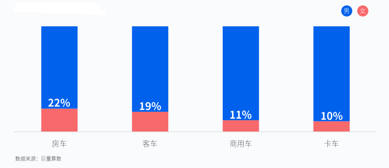 从性别上来看,女性用户占比扩张,深耕女性用户需求也是未来车企的主要课题。货车女性用户12月占总人数约10%,比年初8%有所提升,占比呈扩大趋势。而客车领域,女性用户占据19%,高于整体商用车大盘(11%)和货车人群(10%),尤其在房车领域,女性关注用户占比更高,达到22%。