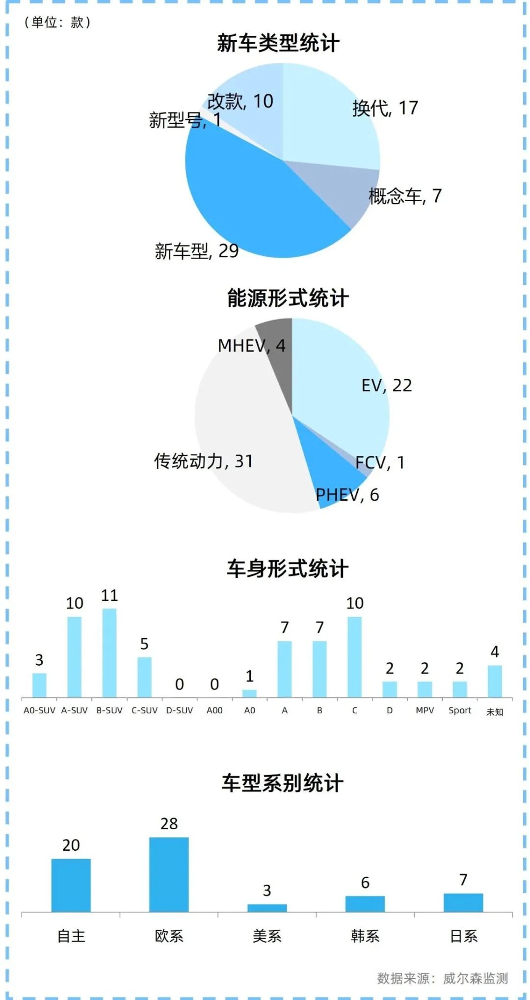 预计北京车展展出新车达64款,新车型占比将近半数达29款,此外,新能源车型达29款,其中纯电动车型有22款;本届车展SUV车型数量约占参展新车总量一半,预计参展数量将达29款。