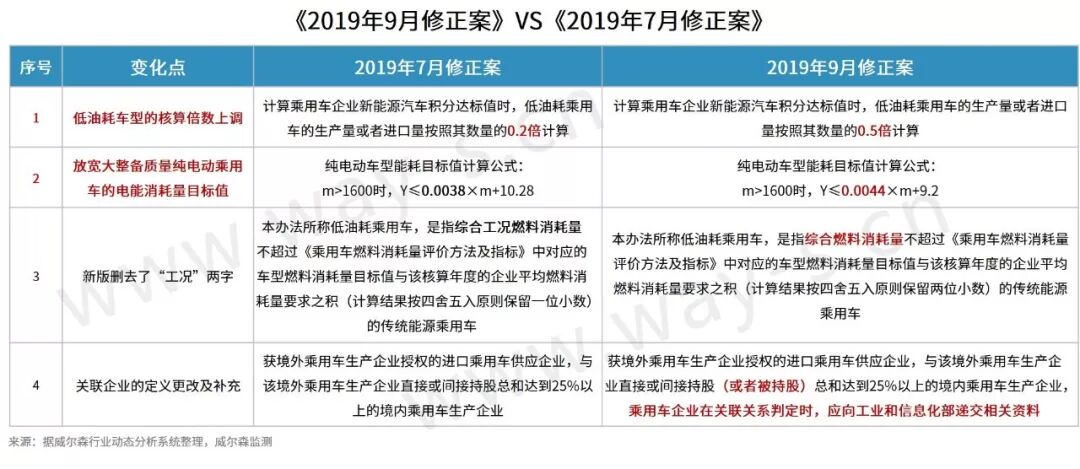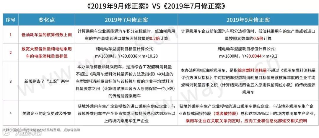 7月9日,工信部发布《乘用车企业平均燃料消耗量与新能源汽车积分并行管理办法》修正案(意见稿),修订重点内容包括新增低油耗车型计算概念,降低NEV积分达标值;提高计算标准参数,降低NEV积分实际值。到了9月11日,工信部发布新一轮《关于修改<乘用车企业平均燃料消耗量与新能源汽车积分并行管理办法>的决定(征求意见稿)》的意见,低油耗车型核算从0.2上调至0.5,但相比传统燃油车仍能降低NEV积分达标值;整备质量大于1.8t纯电动车获取NEV积分难度降低。