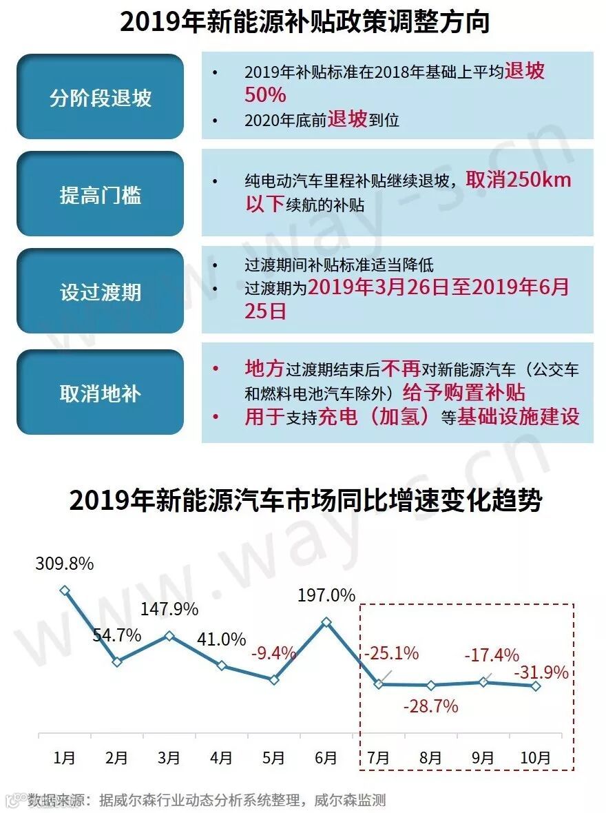 3月26日,财政部发布《关于进一步完善新能源汽车推广应用财政补贴政策的通知》,提出2019年新能源在6月26日正式取消地补,后期主要转向充电(加氢)基础设施的建设。在退坡前期对市场的刺激效果明显,新能源汽车销量大幅增长,提前消耗下半年部分潜在订单,导致下半年新能源市场进入低迷状态。但另一方面,基础设施建设不断完善,截至2019年10月,中国公共类充电桩数量达到47.81万个,为新能源汽车创造良好的使用环境。
