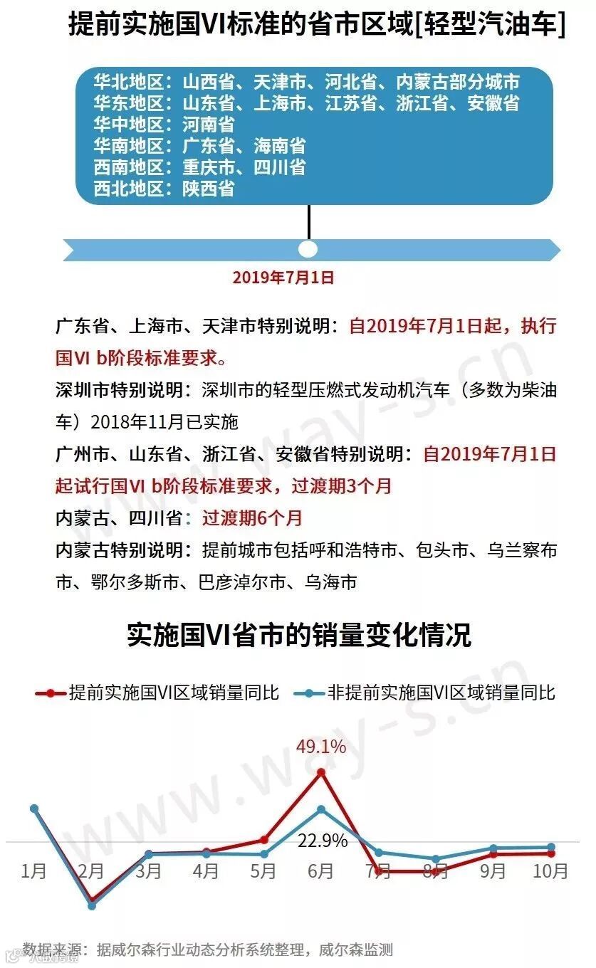 7月1日,部分区域提前执行国VI标准,含14省市以及内蒙古部分城市,影响6月提前实施区域的销量同比比非提前实施区域高出约27%,但同时也提前消耗了2019年下半年的消费需求。