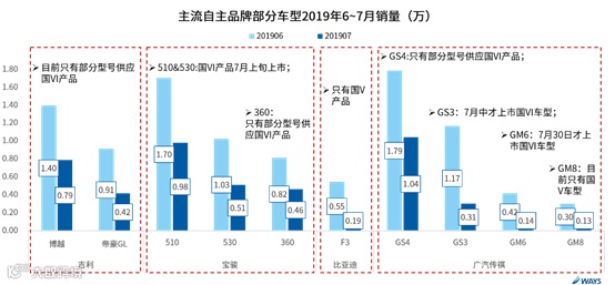 主销车型的国VI产品供应迟缓,造成7月车型销量大幅下滑,品牌销量随之下降。如吉利的博越和帝豪GL,目前只有部分型号供应国VI产品。(其余品牌车型国VI产品的详细投放情况及销量可参考下图)
