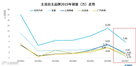 相反,自主品牌对国VI标准的切换“反应”较慢,部分主销车型7月没有国VI产品供应,导致销量出现断崖式下滑。其中以下几个主流自主品牌(吉利、宝骏、上汽荣威、比亚迪、广汽传祺)表现相对明显。