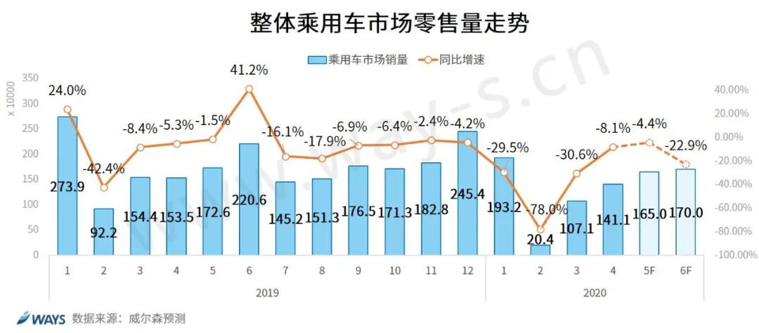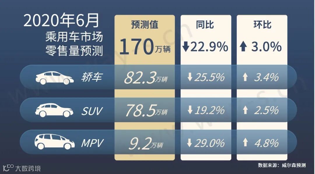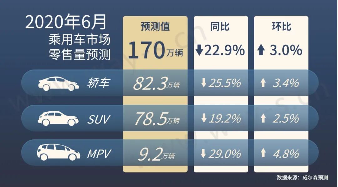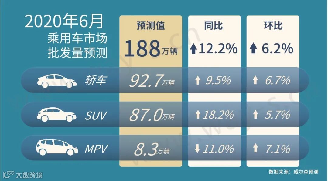 根据威尔森预测,2020年6月整体乘用车市场批发量预计为:188万辆,同比2019年6月上升12.2%。