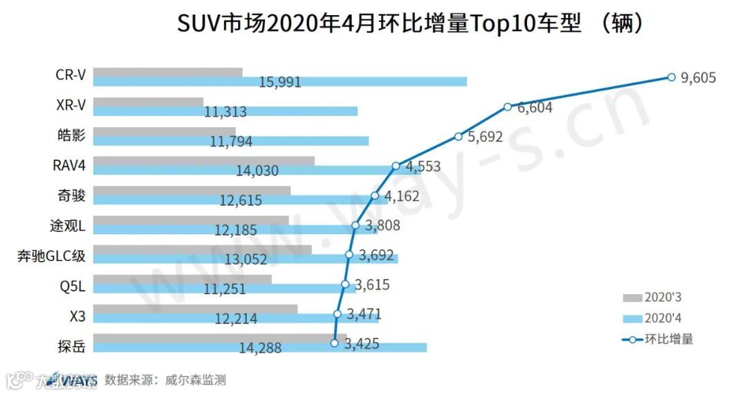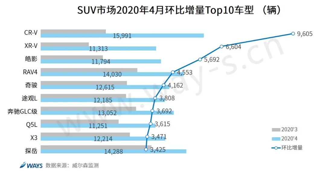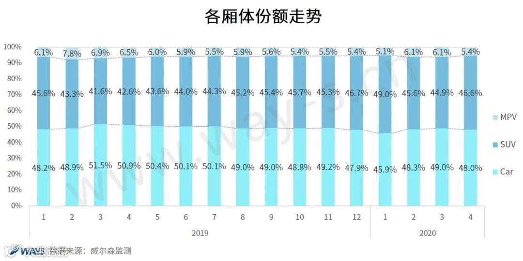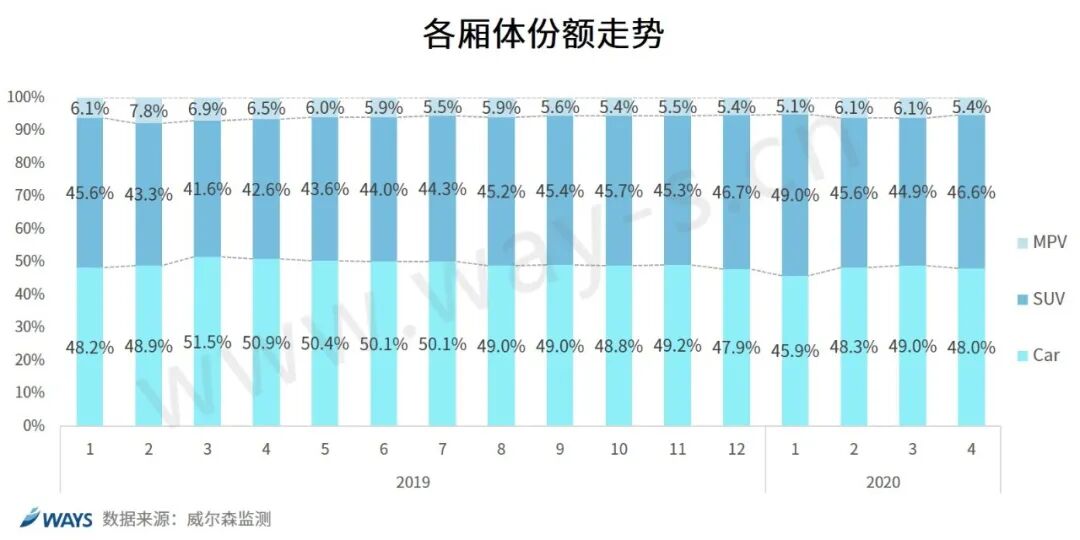 其中,在SUV消费偏好恢复的利好促动下,SUV市场恢复效果最理想,4月销量同比逆势实现小幅正增长0.5%,份额环比3月上升1.7%。