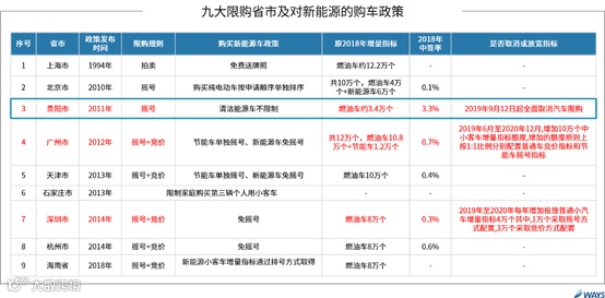 在今年6月国家发改委等三部委要求应当取消汽车限购、限行政策时,广州、深圳率先积极响应,分别增加了不同数额的小客车增量指标。随后7月,贵阳市公安交通管理局在发布的关于征求废止《贵阳市小客车号牌管理暂行规定》(以下简称《规定》)意见的公告,指出随着交通拥堵逐步缓解、空气环境质量逐步改善、“放管服”改革的不断深入,《规定》已没有存在的必要,建议废止。至9月12日,贵阳市人民政府正式发布了关于废止《规定》公告,自此,贵阳市成为目前全国实行汽车限购政策的9省市中首个全面取消汽车限购的城市。