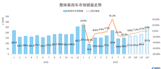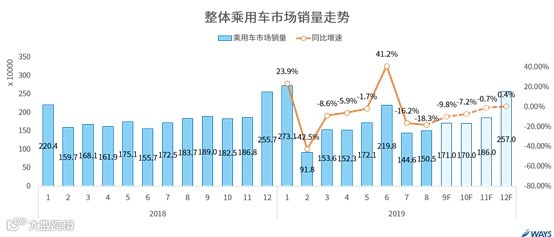 根据威尔森预测,2019年10月乘用车市场预测零售量为170.0万辆,同比下降7.2%,环比下降0.6%。