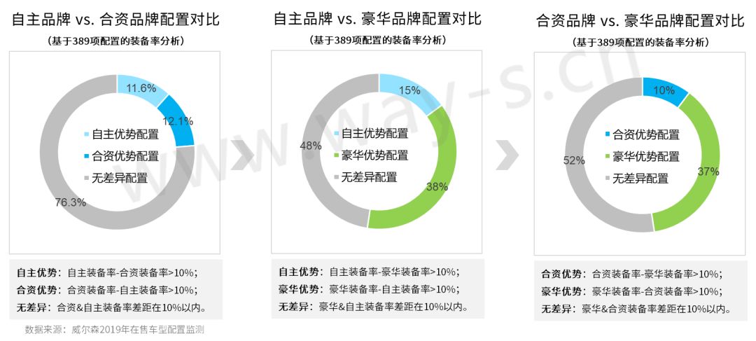 品牌属性比较:当前自主品牌与合资品牌的配置差距较小(差异项占比不足1/4);预示着未来一段时期内,主流自主、合资品牌或形成直接竞争关系。豪华品牌则仍处于绝对领先定位,可通过分析豪华品牌升级方向,预判未来市场趋势。