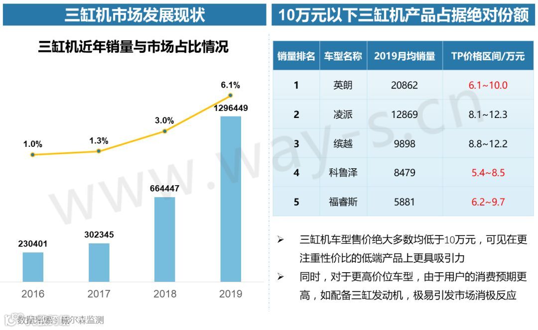 节能减排:近年来,三缸车型销量突飞猛进,所占市场份额连年上升。三缸机的低成本与经济性更符合低端市场消费者需求,未来将在低端产品上大范围普及,目前合资头部品牌丰田和大众也开始规划向旗下低端车型搭载更经济的三缸发动机。