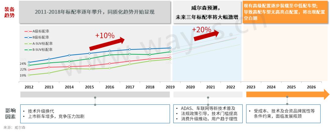 同质化危机:近八年来配置标配幅度增长10%,同级别车型配置呈现出明显的同质化趋势 。未来同质化趋势明显,ADAS、车联网等新兴配置普及后,将出现高亮点配置空白期。