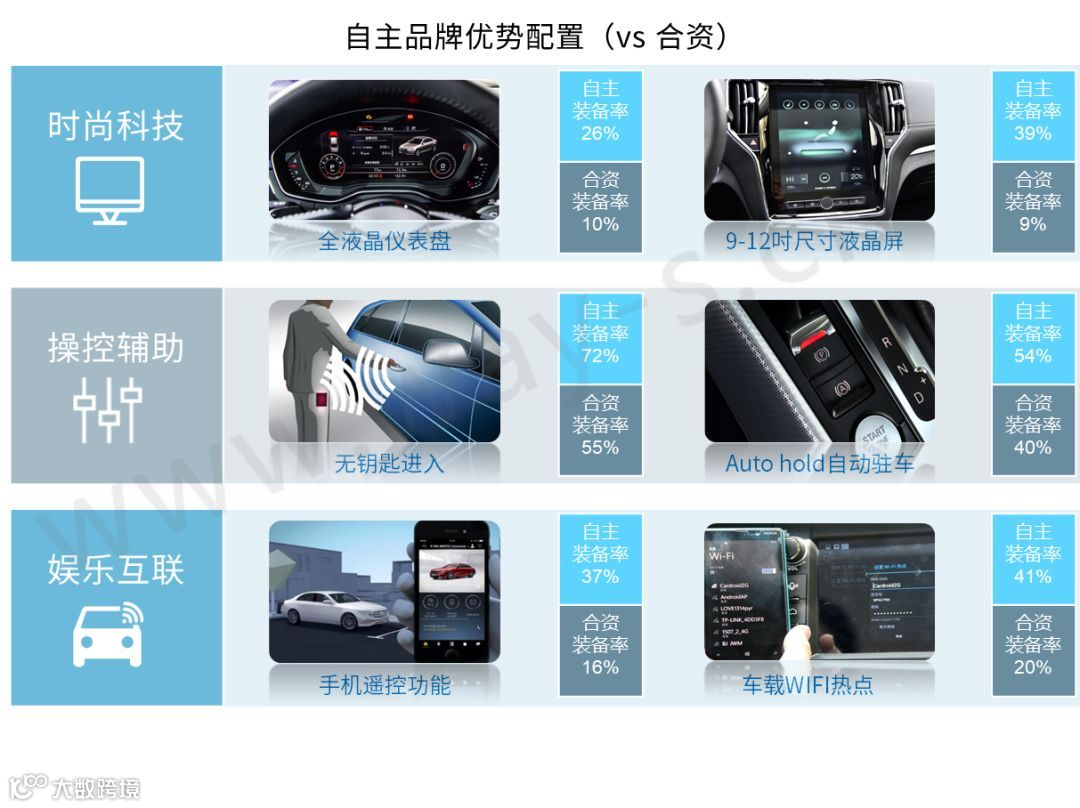 自主品牌优势:侧重时尚科技、操控辅助及娱乐互联。自主品牌近年来,重点在感官类配置方面下工夫,突显时尚潮流和娱乐互联,从而迎合年轻消费者喜好。在新技术方面,受限于成本控制等因素,倾向于优先发展智能网联。