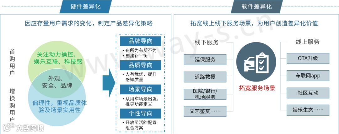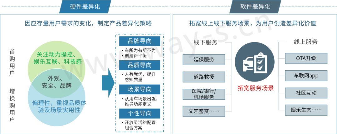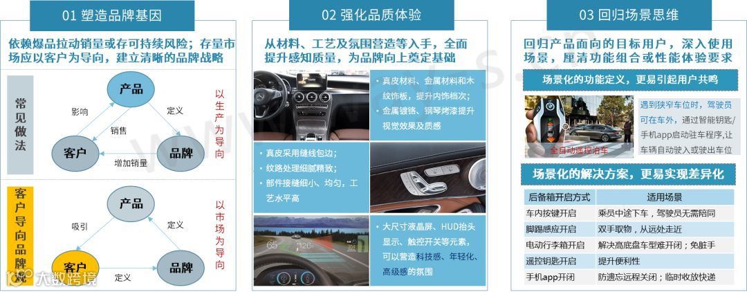 转变产品策略:注重品牌品质,回归场景思维塑造品牌战略。从客户洞察出发,建立清晰的品牌标签,是发挥产品组合增长潜力的关键。未来产品间的差异将由配置差异转为适用场景差异、功能解决路径和功能组合差异。