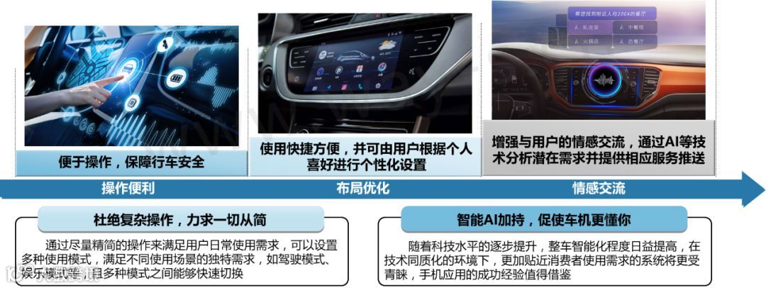 智能网联:车机的人性化体验成为未来决胜之匙,车机功能实现应简单快捷,同时满足用户的个性化设置需求。车机与用户的情感交流成为新一轮热点,能否提供直击用户潜在需求的服务将成为重点。