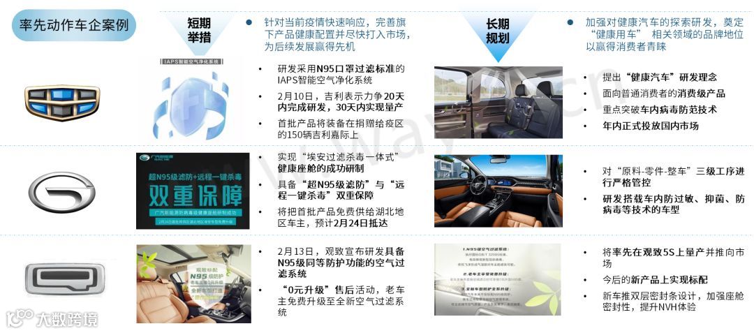 疫情爆发后,部分车企紧急响应,推出健康防护配置,其中吉利、广汽新能源、观致等车企在短期内加紧研发防病毒空气过滤配置,并计划在旗下产品广泛搭载。