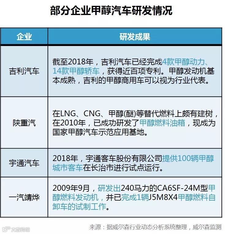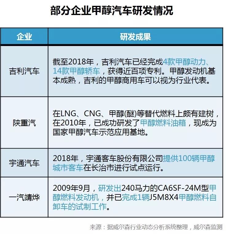 自2012年,工信部在山西、上海、陕西、贵州、甘肃5省市开展甲醇汽车试点工作,为甲醇汽车推广应用奠定了重要的基础。目前中国部分企业已拥有甲醇汽车专有技术。