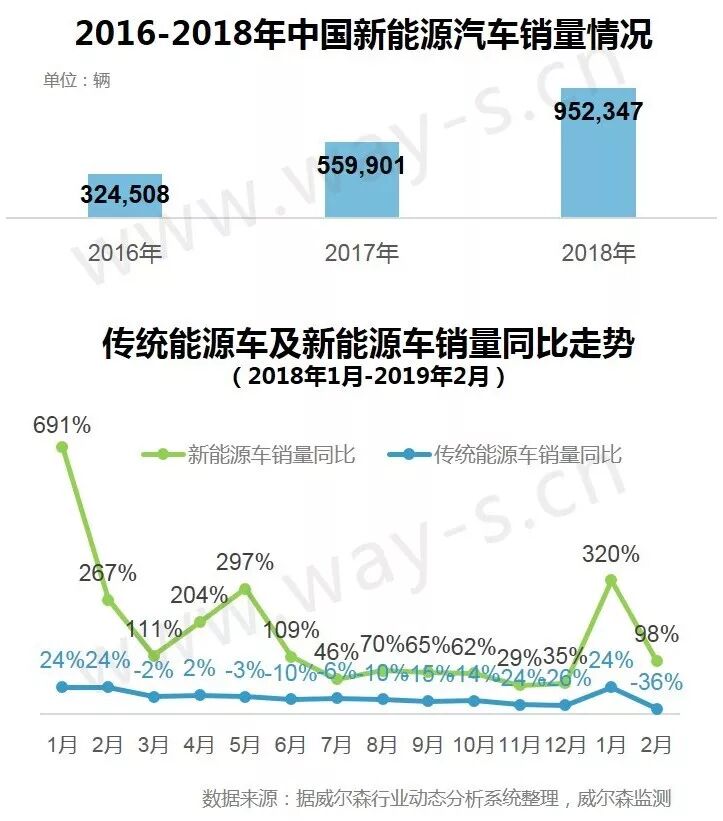据威尔森数据监测,2016至2018年我国新能源车销量不断攀升,2019年传统能源车市销量同比出现持续下滑趋势,但新能源车销量仍在暴涨。目前,随着新能源市场发展逐渐稳定,财政部预算持续收紧。