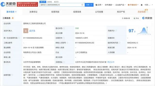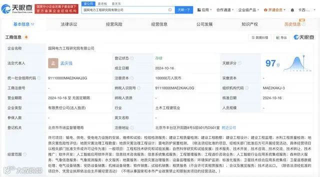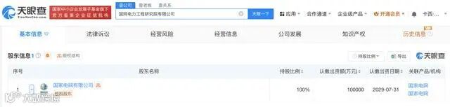 天眼查App显示,近日,国网电力工程研究院有限公司成立,法定代表人为孟庆强,注册资本10亿人民币,经营范围含输电、供电、受电电力设施的安装、维修和试验,检验检测服务,建设工程质量检测,建设工程设计,人工智能应用软件开发等。股东信息显示,该公司由国家电网有限公司全资持股。