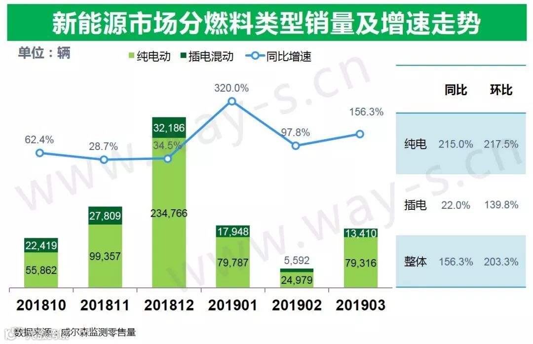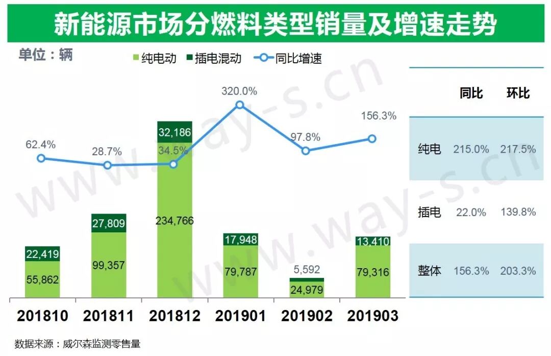 3月新能源市场销量环比大幅上涨,整体市场单月销量达9.3万辆,2019年补贴新政以及厂商限时保价政策在一定程度上刺激了销量的增长。