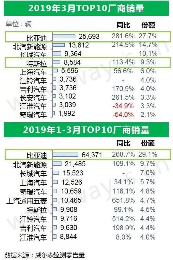 3月,前10厂商市场份额约为84.5%;比亚迪销量大幅增长,市场份额达到27.7%;特斯拉以超8千辆的销量优势一跃跻身前五;累计来看,比亚迪在新能源市场中遥遥领先。