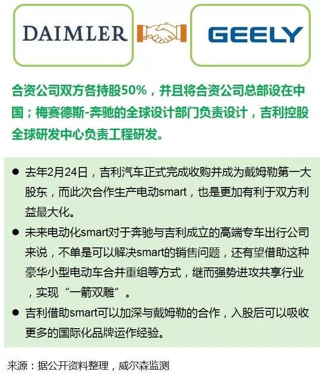戴姆勒股份公司和浙江吉利控股集团达成合作关系,双方将成立合资公司,在全球范围内联合运营和推动smart品牌转型,将smart打造成为电动汽车品牌。