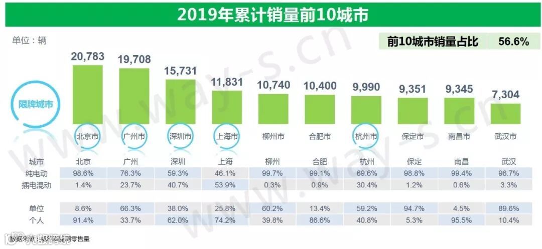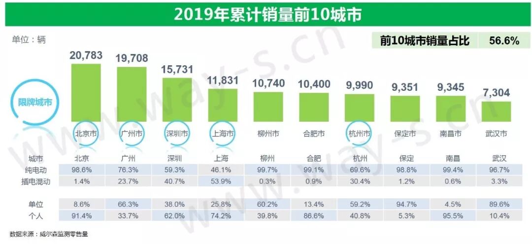 2019年1-3月前10城市份额占56.6%;排名来看,3月北京因特斯拉销量激增,登上全国首位,广州、深圳和上海紧随其后;限牌城市中,仅上海插电混动占比较高;分所有权来看,保定和武汉仍以单位用户为主,且占比均较高。