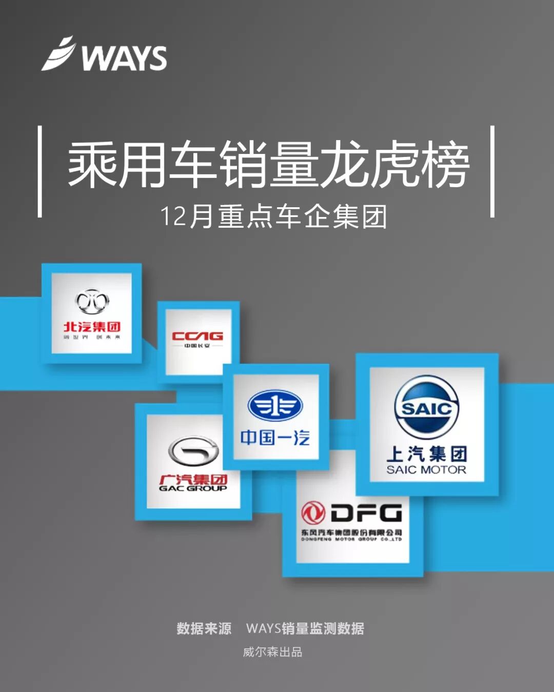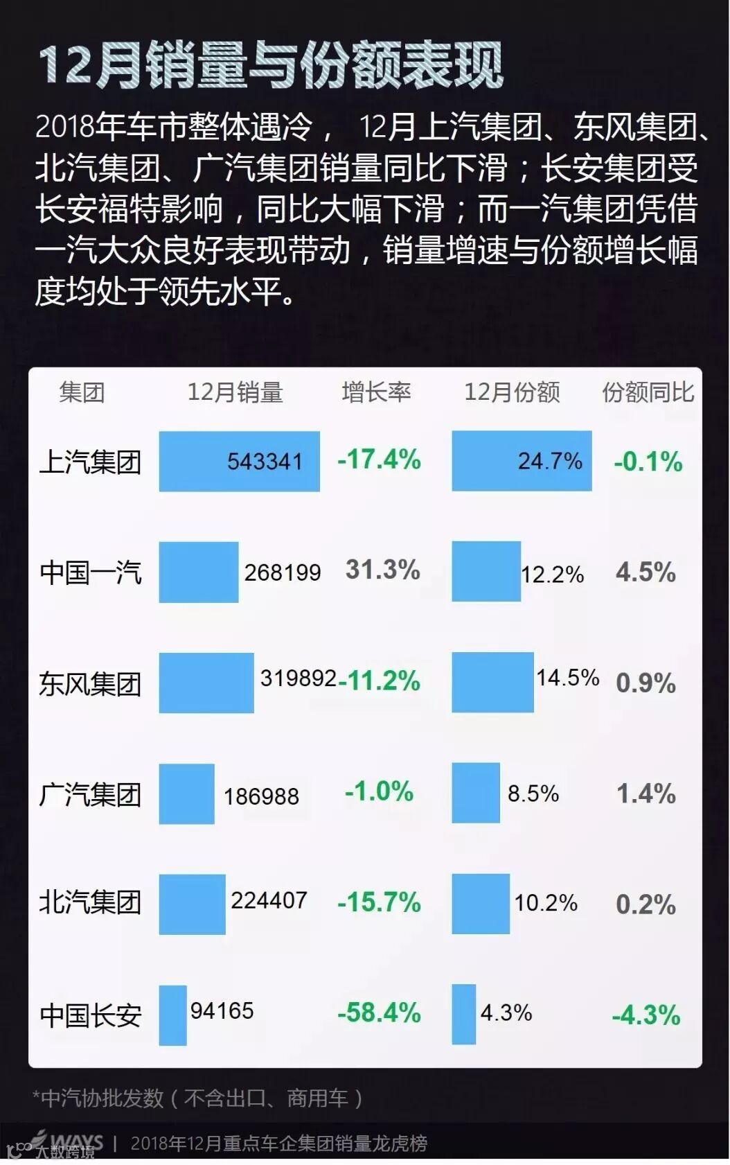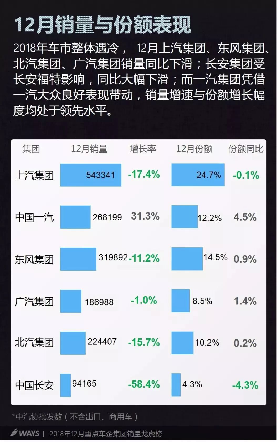 2018年车市整体遇冷, 12月上汽集团、东风集团、北汽集团、广汽集团销量同比下滑;长安集团受长安福特影响,同比大幅下滑;而一汽集团凭借一汽大众良好表现带动,销量增速与份额增长幅度均处于领先水平。