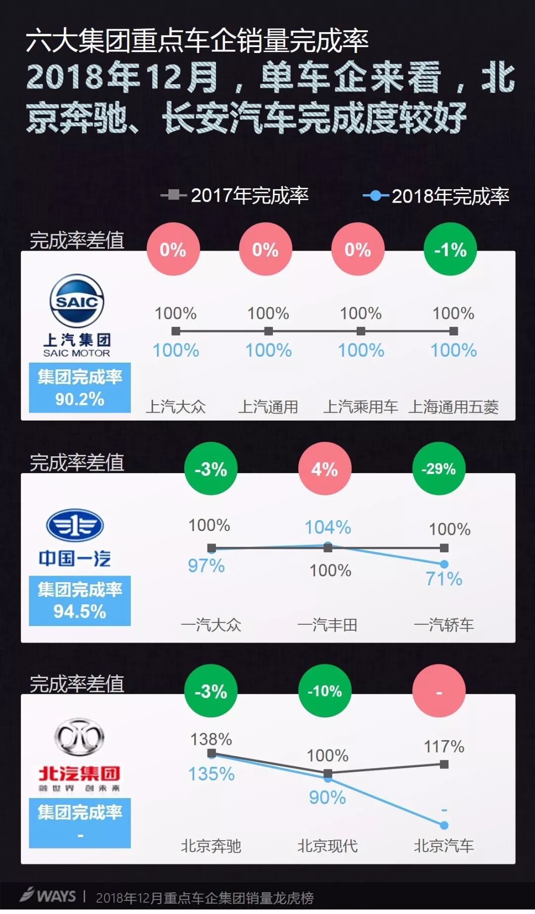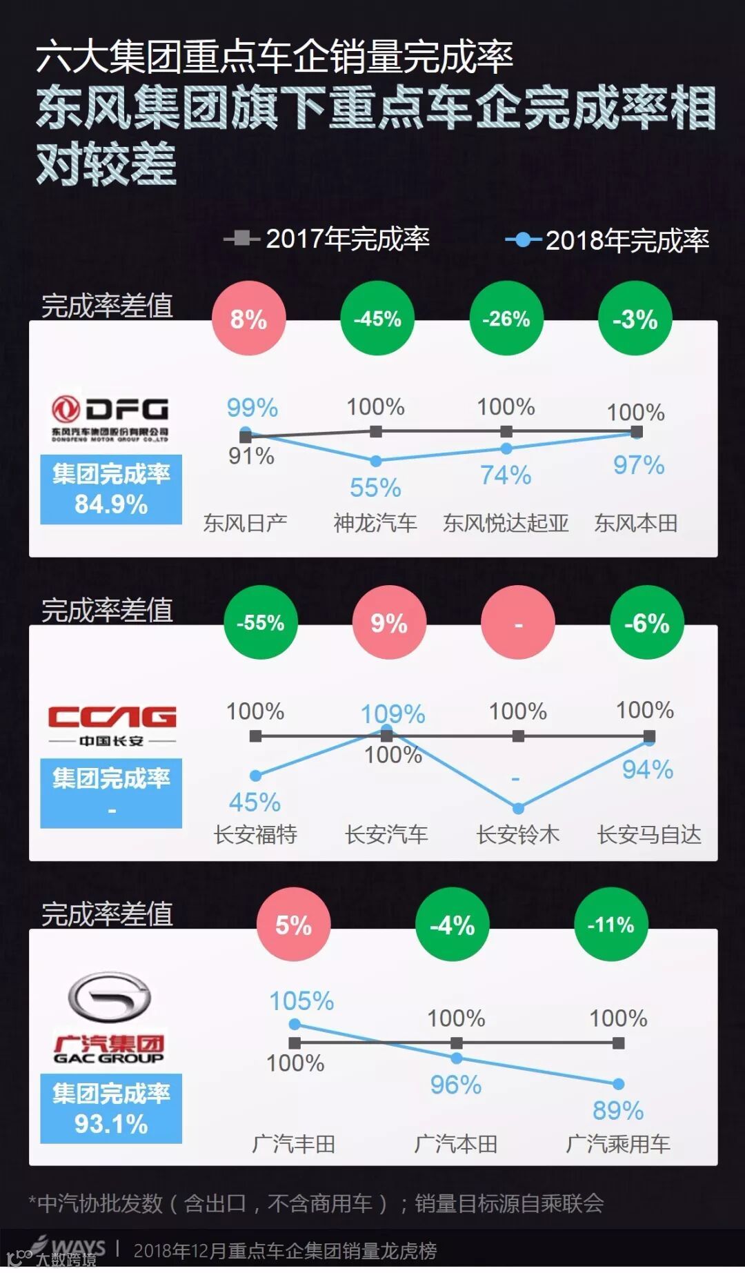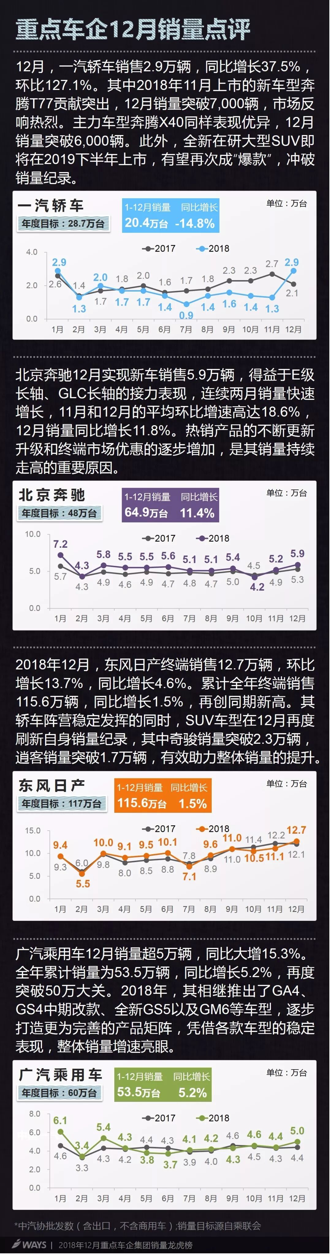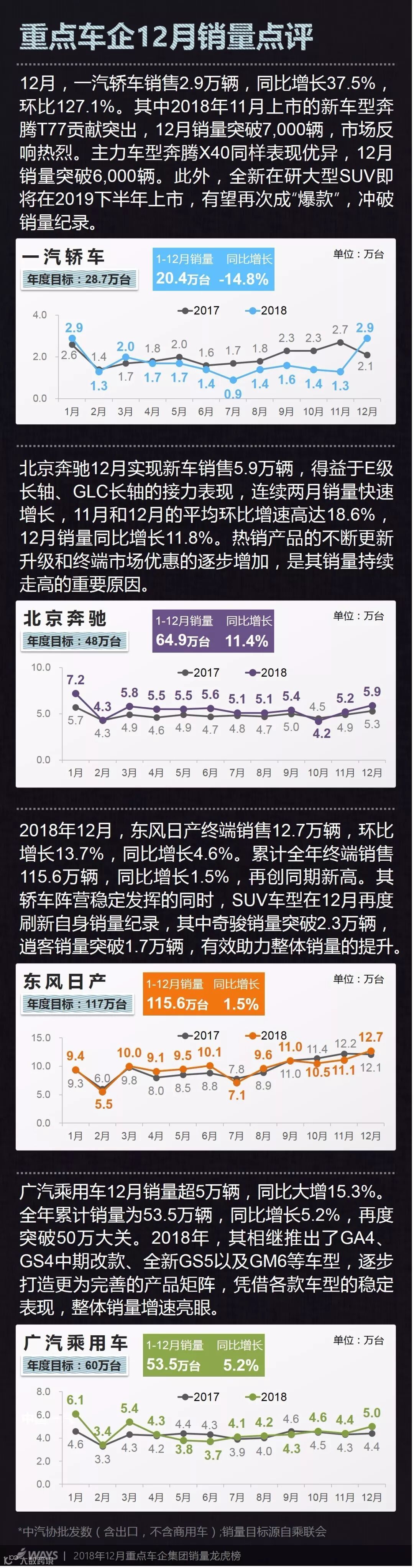 2018年车市整体遇冷, 12月上汽集团、东风集团、北汽集团、广汽集团销量同比下滑;长安集团受长安福特影响,同比大幅下滑;而一汽集团凭借一汽大众良好表现带动,销量增速与份额增长幅度均处于领先水平。