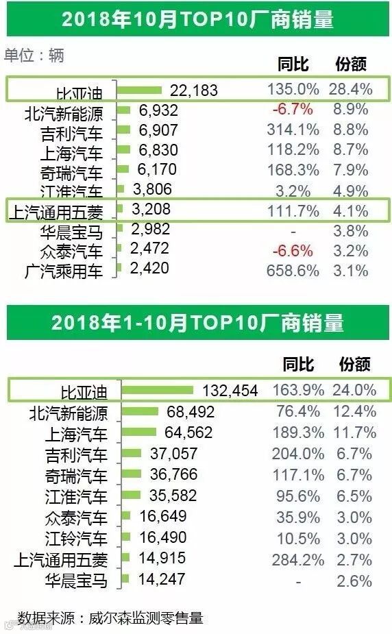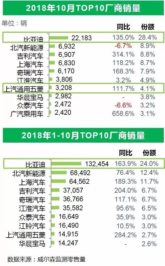 10月,前10厂商市场份额约为81.7%;比亚迪稳居榜首,上汽通用五菱依靠宝骏E200销量跻进前十;累计来看,比亚迪在新能源车市场份额达24.0%,表现十分亮眼。