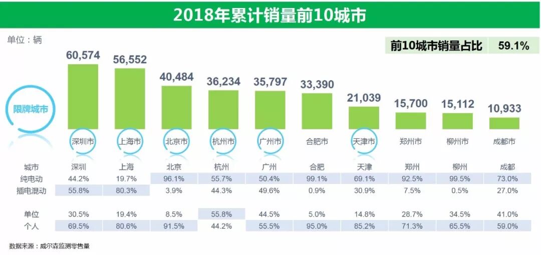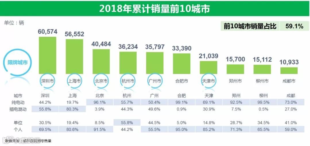 2018年1-10月前10城市份额占59.1%;排名来看,深圳受政策影响,销量突破六万辆;上海和北京分列第二、三位;限牌城市中,深圳、上海插电混动占比较高;分所有权来看,仅杭州单位用户比例较高。