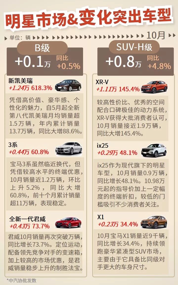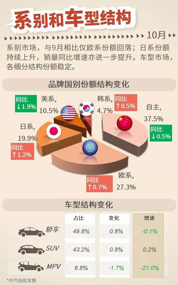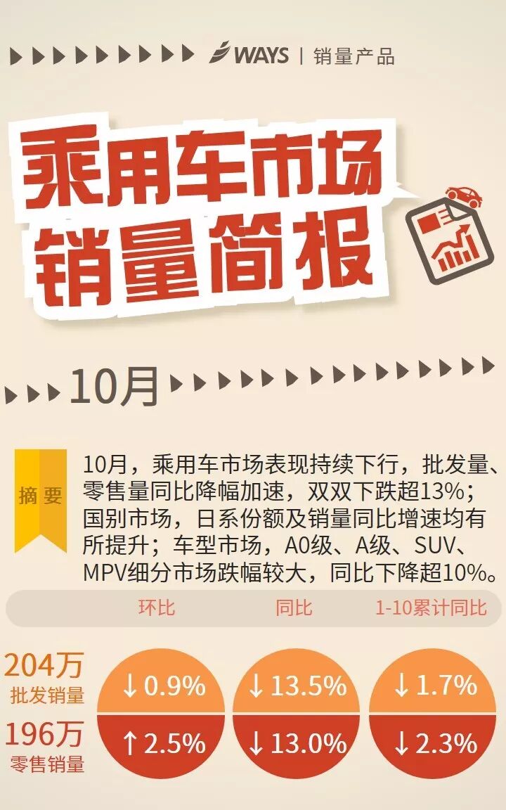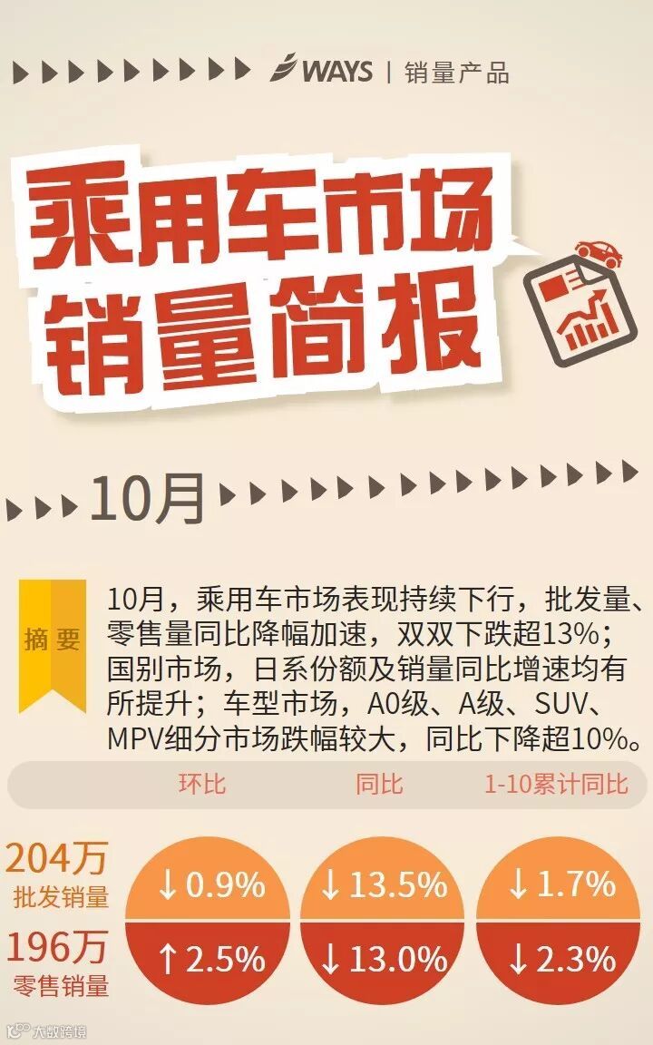 10月,乘用车市场表现持续下行,批发量、零售量同比降幅加速,双双下跌超13%;国别市场,日系份额及销量同比增速均有所提升;车型市场,A0级、A级、SUV、MPV细分市场跌幅较大,同比下降超10%。