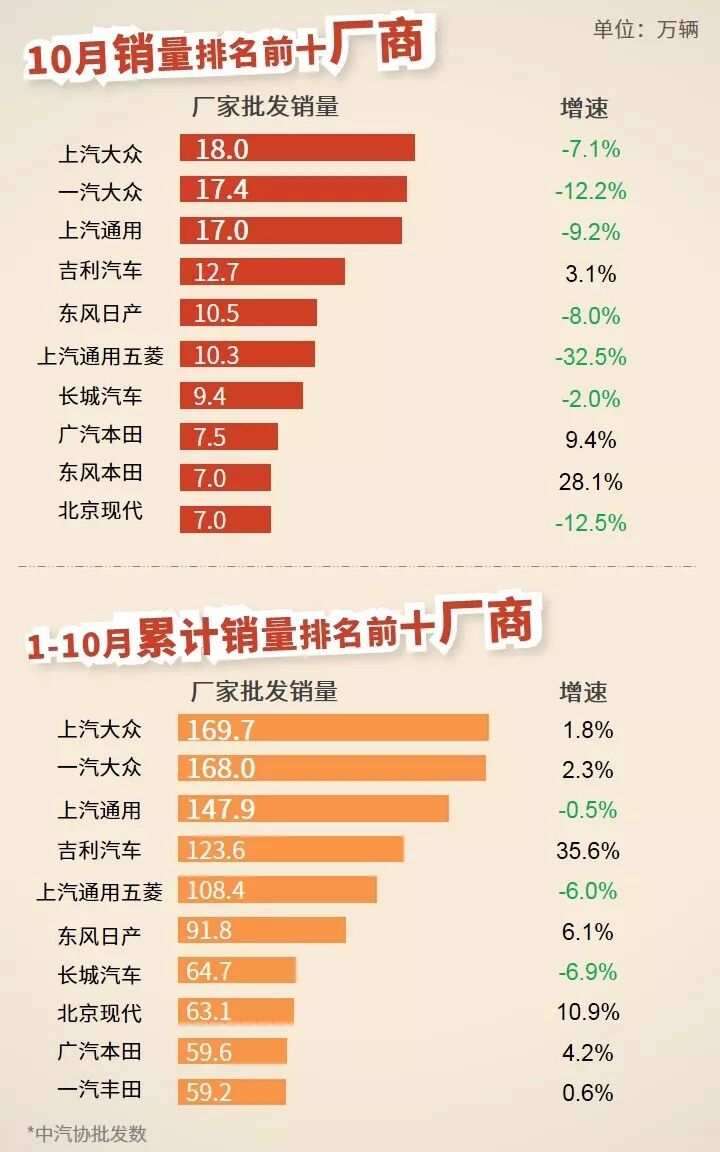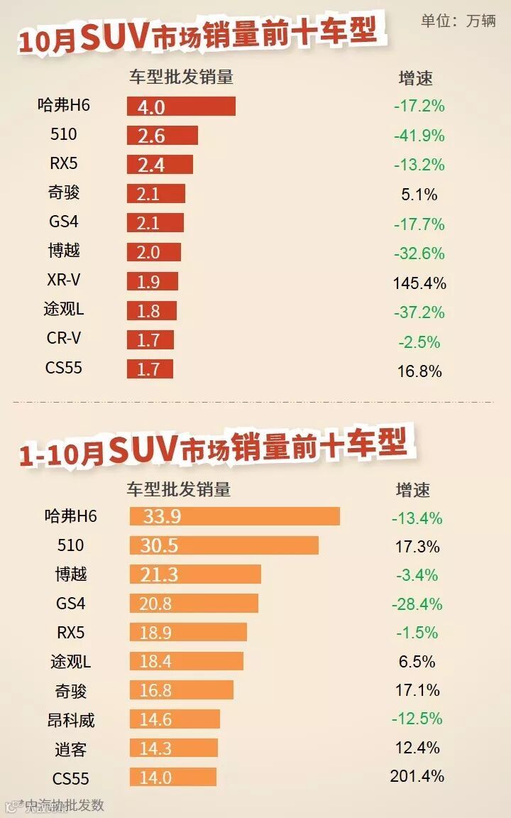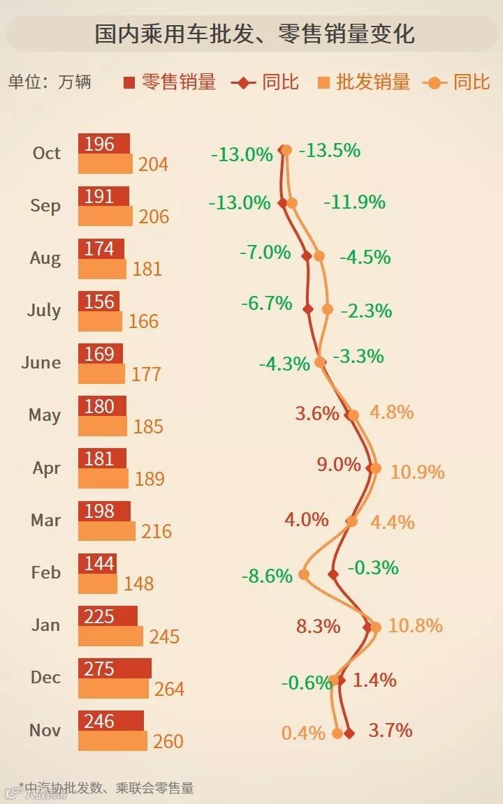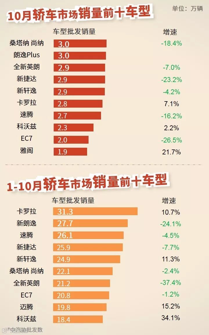 10月,乘用车市场表现持续下行,批发量、零售量同比降幅加速,双双下跌超13%;国别市场,日系份额及销量同比增速均有所提升;车型市场,A0级、A级、SUV、MPV细分市场跌幅较大,同比下降超10%。