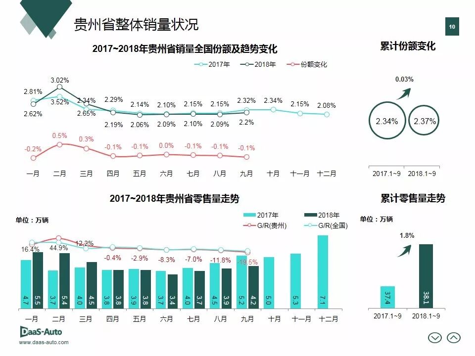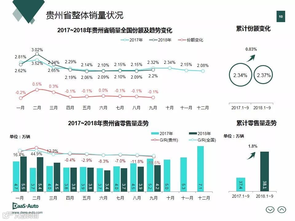 西南地区贵州省1-9月销量达38.1万辆,同比提升1.8%,累计销量份额占全国2.37%;2-3月销量同比增幅高于全国平均水平,4至9月每月均呈现同比下降状态。