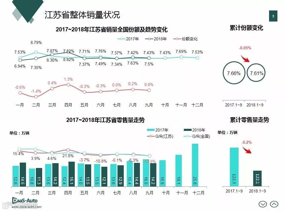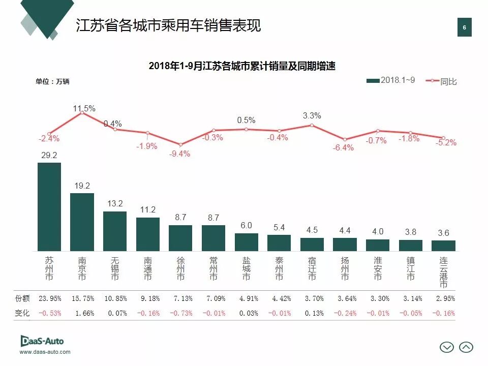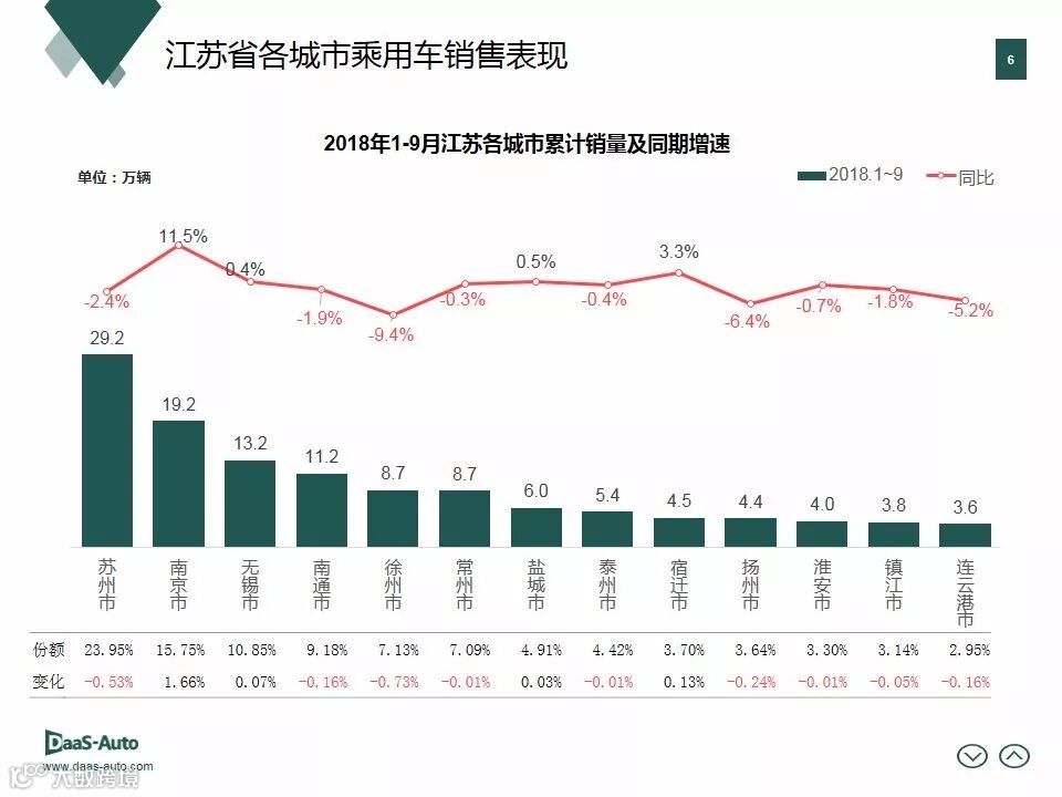 江苏省1-9月累计销量122.1万辆,同比下降0.2%,占全国7.61%的份额;4月份销量同比增速高于全国平均水平,后续月份增速基本与全国一致。