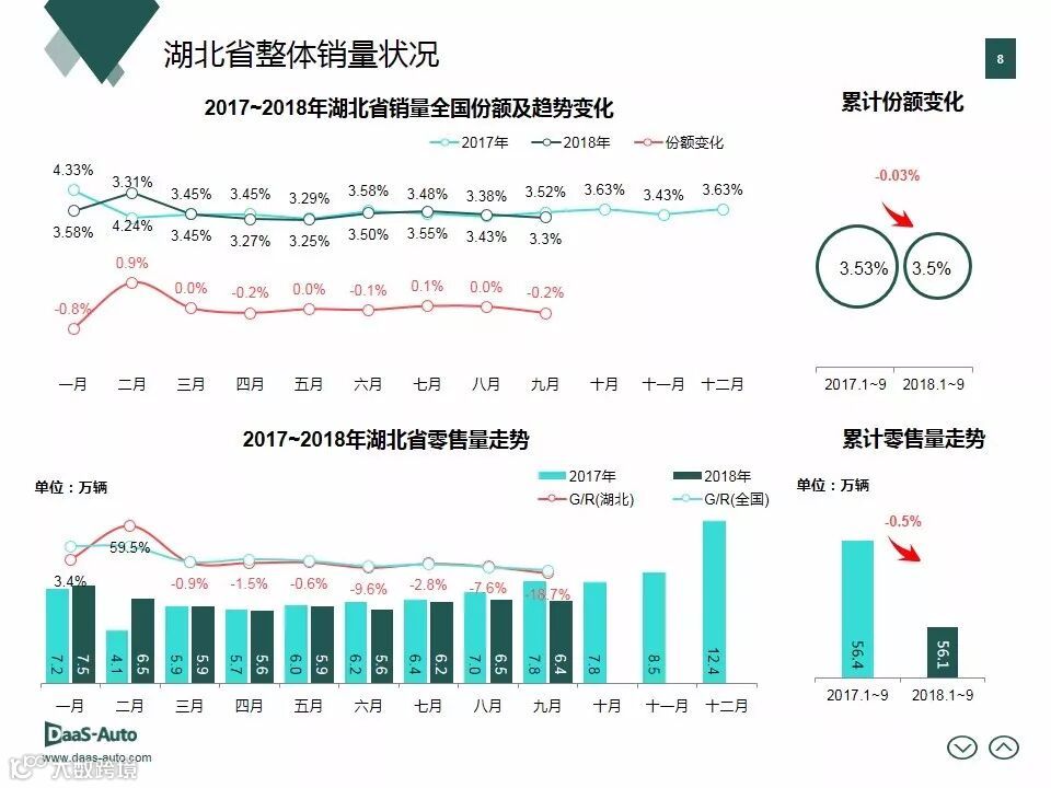 湖北省1-9月累计销量份额基本与2017年同期持平,微降0.03%;1-9月累计销量达56.1万辆,同比下降0.5%,除2月销量同比增速高于全国整体增速外,其余月份基本与全国增速一致。