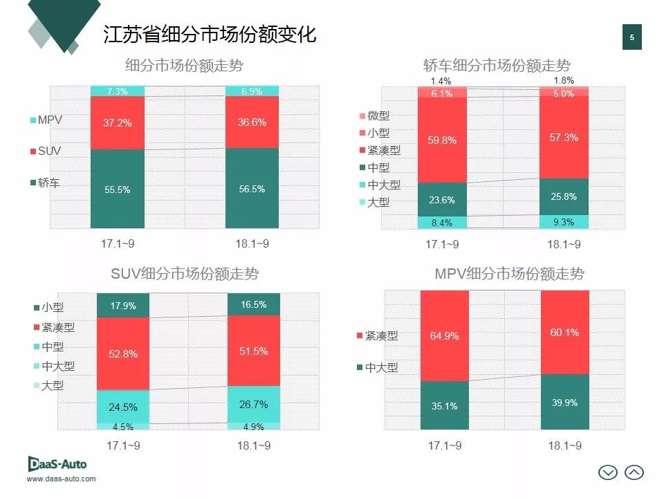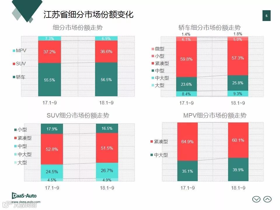 紧凑型轿车在江苏省1-9月销量份额同比下降约2.5%,中型轿车和中大型轿车则迎来份额提升。SUV市场方面,中型与中大型SUV份额均有小幅度提升。