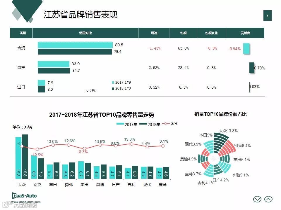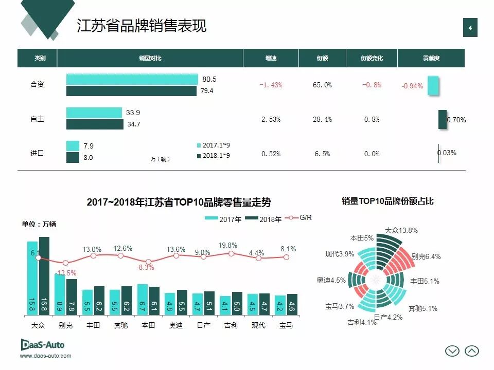合资品牌销量占江苏省份额65%,在江苏省1-9月累计销量同比负增长,下降1.43%。截至9月,别克和本田在江苏省累计销量同比呈现负增长,而ABB均实现同比正增长,其中奥迪与奔驰增幅大于10%;吉利在江苏省的累计销量也实现同比19.8%的增长。
