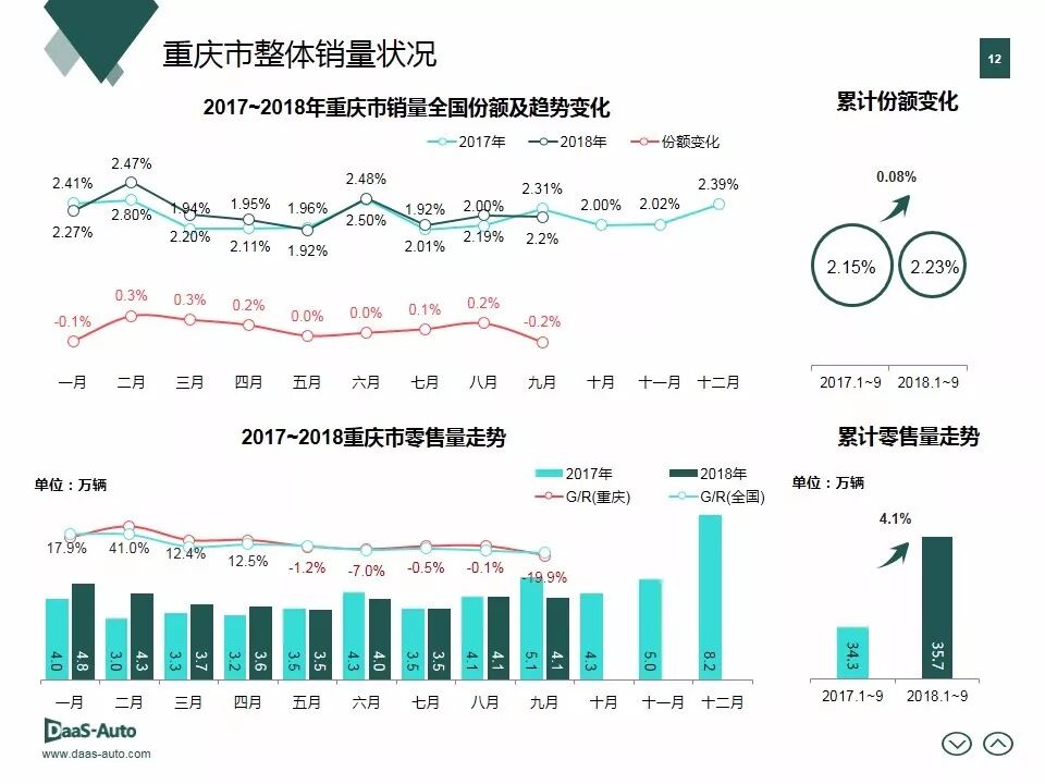 重庆1-9月实现销量35.7万辆,同比上升4.1%,累计销量份额占全国2.23%;其中9月单月销量同比降幅高于全国平均水平。