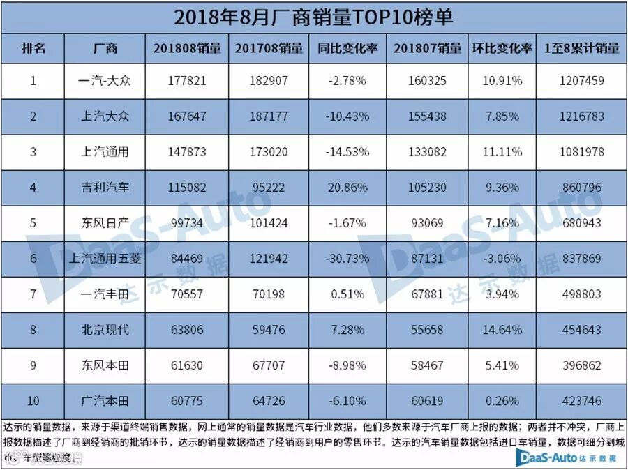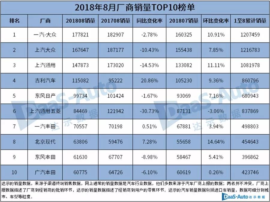 8月销量超过10万辆的厂商共有四家,除了一汽-大众、上汽大众、上汽通用外,吉利汽车也是“月销量十万辆”俱乐部的成员之一,是唯一一个月销量超过10万辆的自主品牌,其销量上涨势头亦十分强劲。同时,吉利汽车也是榜单中销量同比涨幅最大的车企,其已连续4个月保持超过20%的高增长。