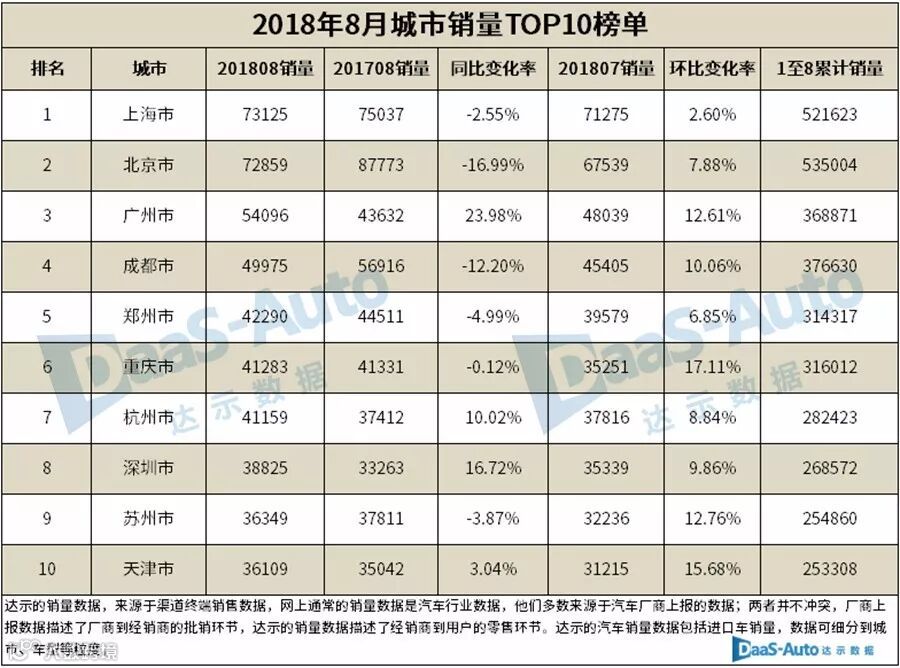8月同比涨幅最大的为广州市,同比上涨了23.98%,以单月销量54,096辆的成绩位列榜单第三。