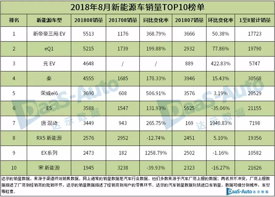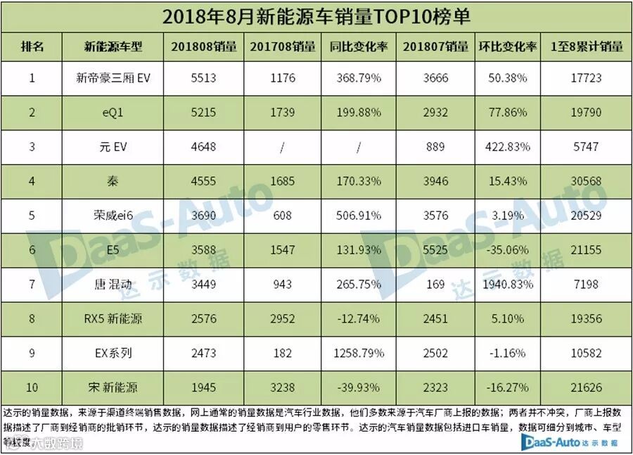 虽比亚迪上榜车型众多,但勇夺第一的是吉利新帝豪三厢EV,8月销量为5,513辆,同比上涨了368.79%,月环比上涨了50.38%,今年前八个月累计销量为17,723辆。