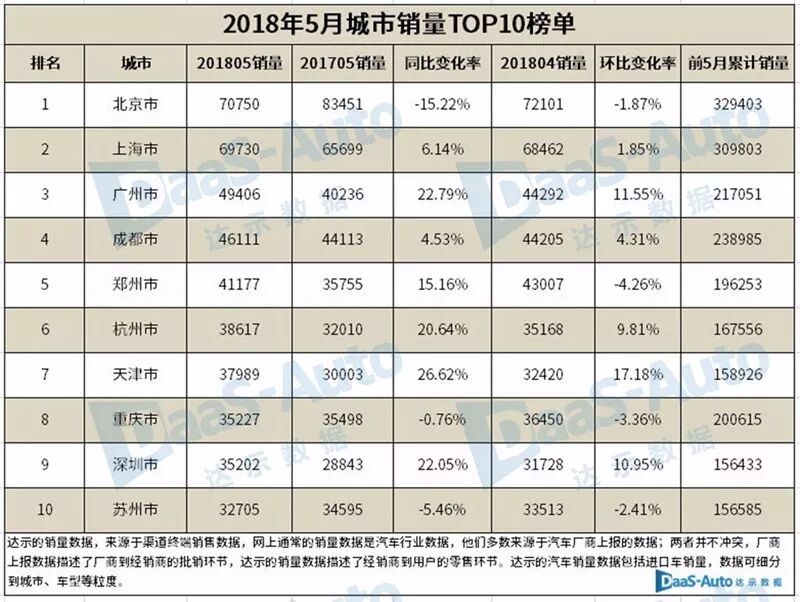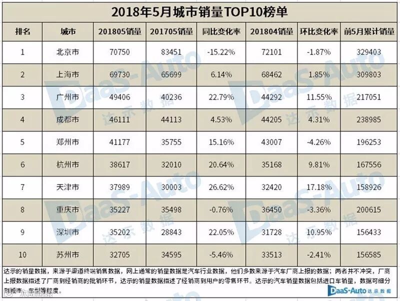 4月位列第四的广州市,在5月则挤下了成都市成功进入前三,销量为49,406辆,同比增长22.79%。此外,值得注意的还有,4月“北上广深”四大超级城市中唯一没有进入前十榜单的深圳,5月销量也同比增长了22.05%,销量达35,202辆,位列第九。