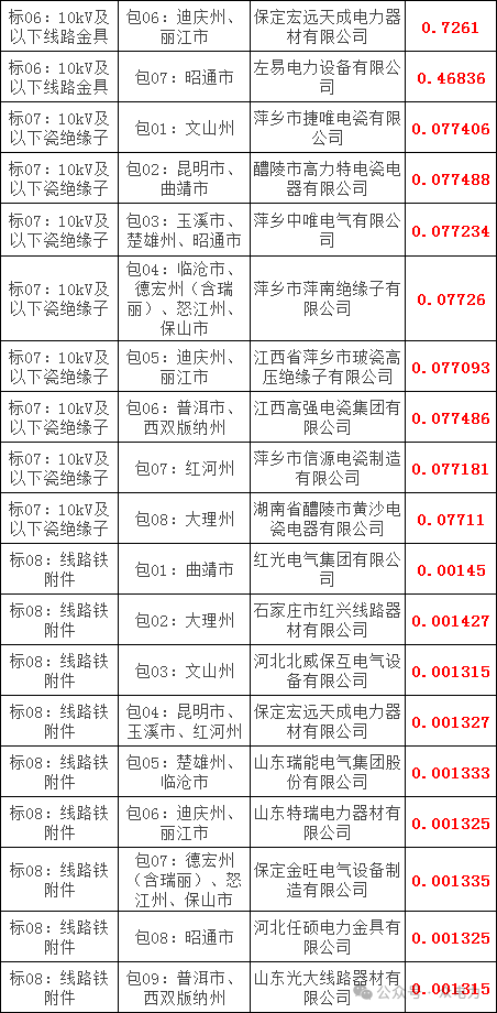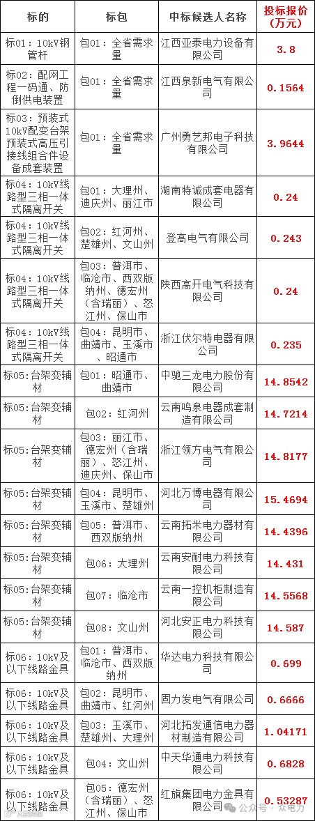 云南电网有限责任公司2024年配网基建第2批物资框架采购(公开招标),经评标委员会评审,现将中标候选人公示如下: