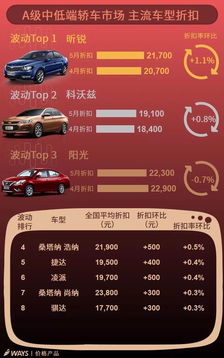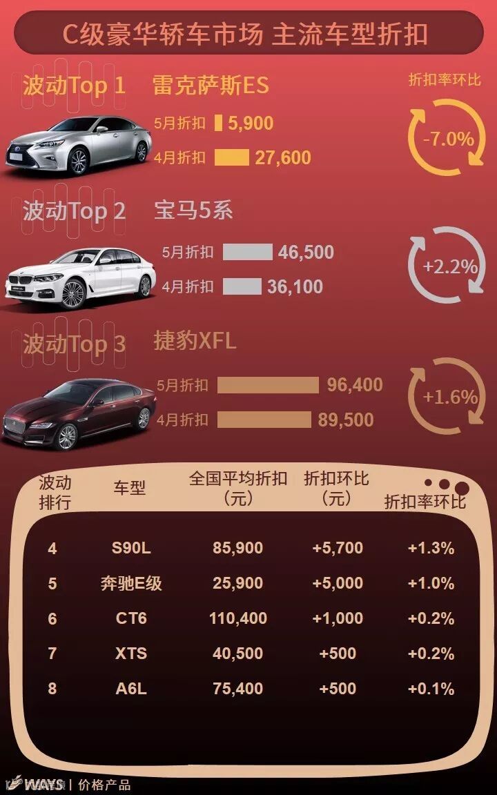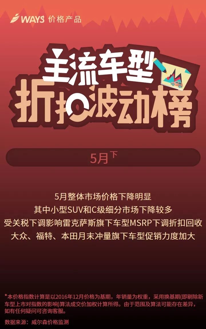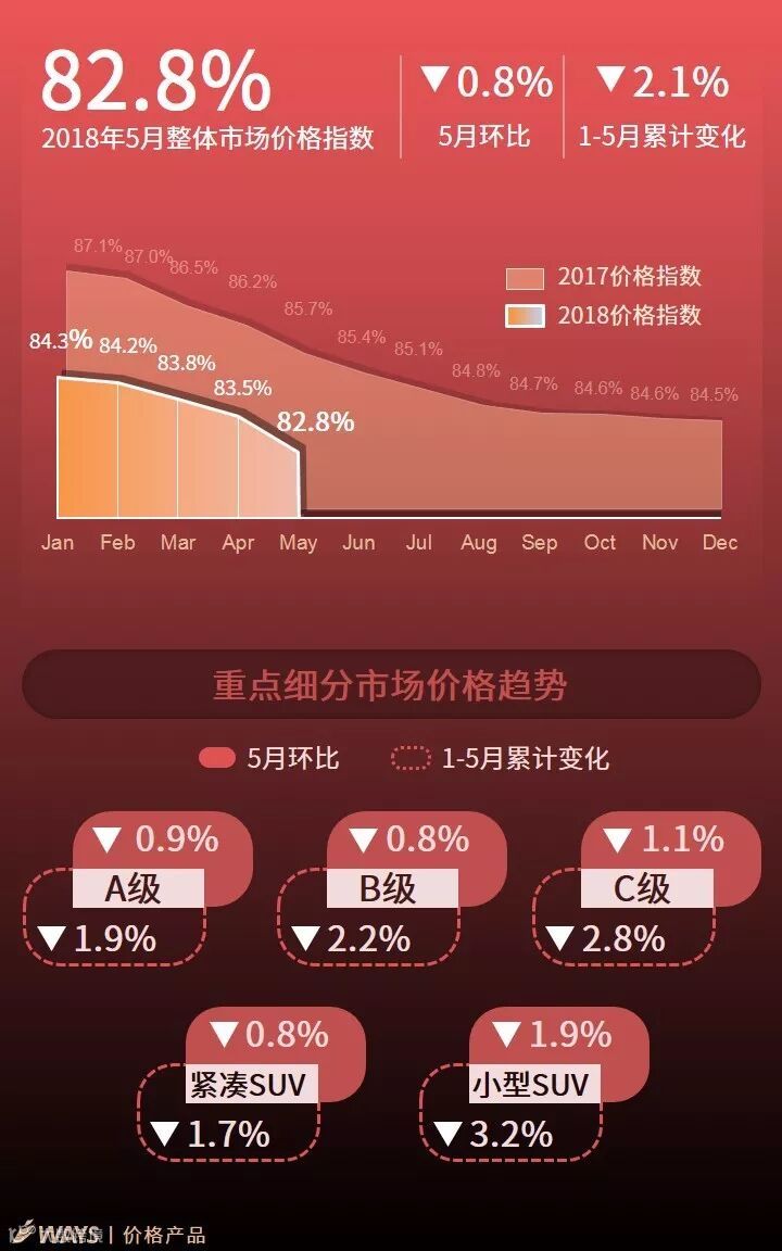 2018年5月下半月,整体市场价格下降明显,其中小型SUV和C级细分市场价格下降较多,降幅分别为1.9%、1.1%。